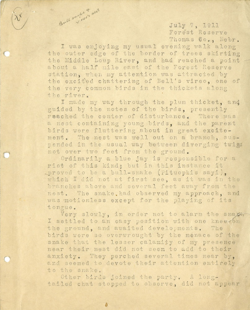 1 Bull snake & vireo's nest July 7, 1911 Forest Reserve Thomas Co., Nebr. I was enjoying my usual evening walk along the outer edge of the border of trees skirting the Middle Loup River, and had reached a point about a half mile east of the Forest Reserve station, when my attention was attracted by the excited chattering of Bell's vireo, one the very common birds in the thickets along the river. I made my way through the plum thicket, and, guided by the notes of the birds, presently reached the center of disturbance. There was a nest containing young birds, and the parent birds were fluttering about in great excitement. The nest was well out on a branch, suspended in the usual way between diverging twigs not over two feet from the ground. Ordinarily a blue jay is responsible for a riot of this kind ; but in this instance it proved to be a bull-snake. ( Pituophis sayi ), which I did not at first see, as it was in the branches above and several feet away from the nest. The snake had observed my approach, and was motionless except for the playing of its tongue. Very slowly, in order not to alarm the snake, I settled to an easy position with one knee on the ground, and awaited developments. The birds were so overwrought by the menace of the snake that the lesser calamity of my presence near their nest did not seem to add to their anxiety. They perched several times near by, and seemed to devote their attention entirely to the snake. Other birds joined the party. A long-tailed chat stopped to observe, did not appear