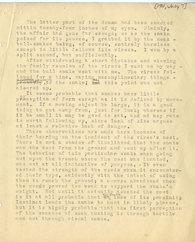 3 The latter part of the drama has been enacted within twenty-four inches of my eyes. Plainly, the affair had gone far enough; so as the snake poised for its pounce, I grabbed it by the neck- bull-snakes being, of course, entirely harmless except to little fellows like vireos. I won by a split second, but sufficiently. After withdrawing a short distance and viewing the family reunion of the vireos I went on my way- and the bull-snake went with me. The vireos followed for a time, saying uncomplimentary things- probably presumably to the snake; but the this point was not cleared up. It seems probable that snakes have little re er perception of form except as it is defined by movement. If a moving object be large, it is a good thing to get away from, just for luck; whereas if it be small it may be good to ear, and at any rate is worth following up, since lack of size argues at least a relative lack of danger. These observations are made here because of their bearing on the incident of the vireo's nest. There is not a shadow of likelihood that the snake saw the nest from the ground and went up after it. The behavior of this particular snake when going out upon the branch where the nest was located, was not at all indicative of purpose. It even tested the strength of the weeds when it encountered their tops, evidently with the intent of using them to reach the ground; a course abandoned when the weeds proved too weak to support the snake's weight. Not until it actually touched the nest is it at all probably that it the snake knew of its proximity. Instinct leads the snake to hunt in likely places, but it is highly probable that the first perception of the success of such hunting is through tactile and not through visual sense.