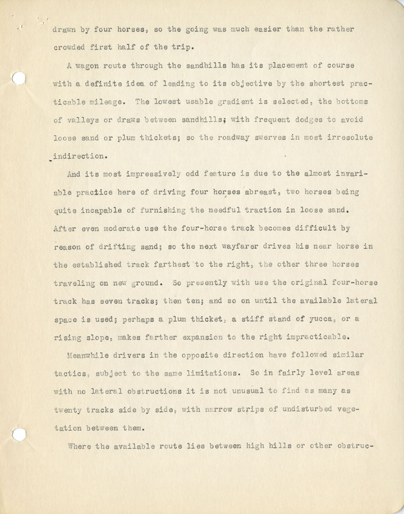 2 drawn by four horses, so the going was much easier than the rather crowded first half of the trip. A wagon route through the sandhills has its placement of course with a definite idea of leading to its objective by the shortest practicable mileage. The lowest usable gradient is selected, the bottoms of valleys or draws between sandhills; with frequent dodges to avoid loose sand or plum thickets; so the roadway swerves in most irresolute indirection. And its most impressively odd feature is due to the almost invariable practice here of driving four horses abreast, two horses being quite incapable of furnishing the needful traction in loose sand. After even moderate use the four-horse track becomes difficult by reason of drifting sand; so the next wayfarer drives his near horse in the established track farthest to the right, the other three horses traveling on new ground. So presently with use the original four-horse track has seven tracks; then ten; and so on until the available lateral space is used; perhaps a plum thicket, a stiff stand of yucca, or a rising slope, makes further expansion to the right impracticable. Meanwhile drivers in the opposite direction have followed similar tactics, subject to the same limitations. So in fairly level areas with no lateral obstructions it is not unusual to find as many as twenty tracks side by side, with narrow strips of undisturbed vegetation between them. Where the available route lies between high hills or other obstruc-