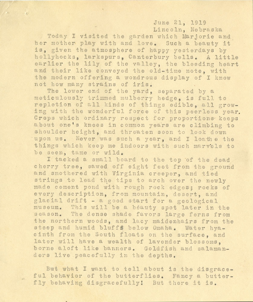 1 June 21, 1919 Lincoln, Nebraska Today I visited the garden which Marjorie and her mother play with and love. Such a beauty it is, given the atmosphere of happy yesterdays by hollyhocks, larkspurs, Canterbury bells. A little earlier the lily of the valley, the bleeding hearts, and their like conveyed the old-time note, with the modern offering a wondrous display of I know not how many strains of iris.The lower end of the yard, separated by a meticulously trimmed mulberry hedge, is full to repletion of all kinds of things edible, all growing with the wonderful force of this peerless year. Crops which ordinary respect for proportions keeps about one’s knees in common years are climbing to shoulder height, and threaten soon to look down upon us. Never was such a year, and I loathe the things which keep me indoors with such marvels to be seen, tame or wild.I tacked a small board to the top of the dead cherry tree, sawed off eight feet from the ground and covered with Virginia creeper, and tied strings to lead the tips to arch over the newly made cement pond with rough rock edges; rocks of every description, from mountain, desert, and glacial drift – a good start for a geological museum. This will be a beauty spot later in the season. The dense shade favors large ferns from the northern woods, and lacy maidenhairs from the steep and humid bluffs below Omaha. Water hyacinth from the South floats on the surface, and later will have a wealth of lavender blossoms, borne aloft like banners. Goldfish and salamanders live peacefully in the depths.But what I want to tell about is the disgraceful behavior of the butterflies. Fancy a butterfly behaving disgracefully! But there it is.