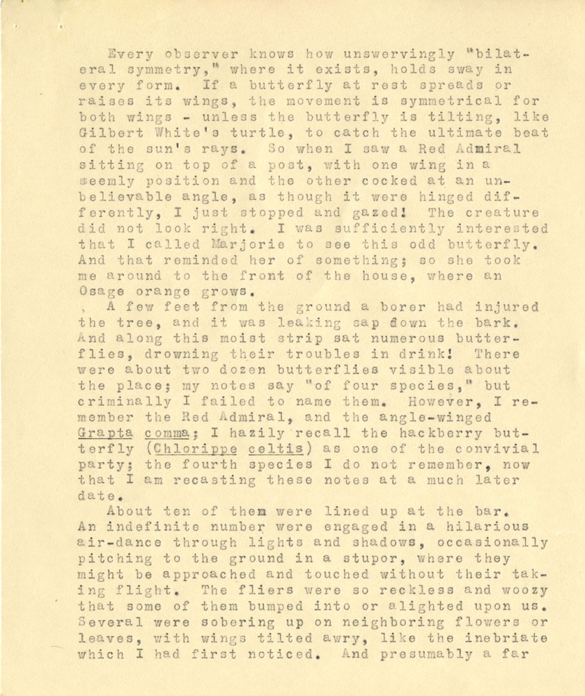 2 Every observer knows how unswervingly “bilateral dynmetry,” where it exists, holds away in every form. If a butterfly at rest spreads or raises its wings, the movement is symmetrical for both wings – unless the butterfly is tilting, like Gilbert White’s turtle, to catch the ultimate beat of the sun’s rays. So when I saw a Red Admiral sitting on top of a post, with one wing in a seemly position and the other cocked at an unbelievable angle, as though it were hinged differently, I just stopped and gazed! The creature did not look right. I was sufficiently interested that I called Marjorie to see this odd butterfly. And it reminded her of something; so she took me around to the front of the house, where an Osage orange grows. A few feet from the ground a borer had injured the tree, and it was leaking sap down the bark. And along this moist strip sat numerous butterflies, drowning their troubles in drink! There were about two dozen butterflies visible about the place; my notes say “of four species,” but criminally I failed to name them. However, I remember the Red Admiral, and the angle-winged Grapta comma; I hazily recall the hackberry butterfly (Chlorippe celtis) as one of the convivial party; the fourth species I do not remember, now that I am recasting these notes at a much later date. About ten of them were lined up at the bar. An indefinite number were engaged in a hilarious air-dance through lights and shadows, occasionally pitching to the ground in a stupor, where they might be approached and touched without their taking flight. The fliers were so reckless and woozy that some of them bumped into or alighted upon us. Several were sobering up on neighboring flowers or leaves, with wings tilted awry, like the inebriate which I had first noticed. And presumably a far