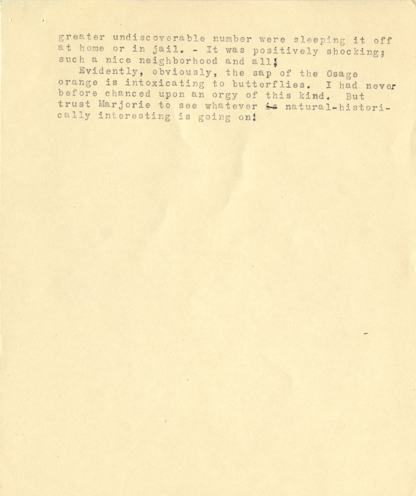 3 greater undiscoverable number were sleeping it off at home or in jail. – It was positively shocking; such a nice neighborhood and all! Evidently, obviously, the sap of the Osage orange is intoxicating to butterflies. I had never before changed upon an orgy of this kind. But trust Marjorie to see whatever is natural-historically interesting is going on!