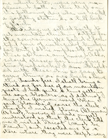 7 one which bites, were very unpleasant both on this trip & on the following day when we visited a forestry station on a hill back of Zürich . Thu Friday, we sallied forth to get mountain climbing outfits for the excursions. We found a beautiful pair of waterproof knickers for Fritz (It is impossible to get these at home, anymore). Also, colored glasses for snow-glare & two knapsacks. I am delighted with these: it is so easy to carry things on ones back & have the hands free. I shall bring a third one for use of our mountain guests. I had quite a time getting me some bloomers, as I did not know the German word. When I said “bloomers,” of course the clerk thought I wished flowers ( “Blumen” ) At last, however I made myself understood so that the clerk told me I wished “Tricot” (must be French) and escorted me to a store where they were kept: very