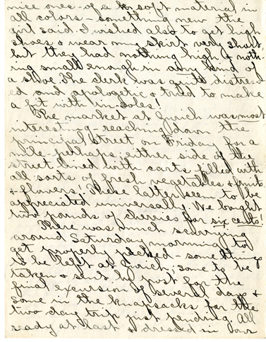 8 nice ones — of a h soft material in all colors — something new the girl said. I wished also to get high shoes & wear my skirt very short, but they had nothing high & nothing small enough in any kind of a shoe. The clerk was quite distressed and apologetic & tried to make a fit with in-soles! The market at Zürich was most interesting — reaching down the principal street on Friday for a mile — perhaps; either side of the street lined with carts filled with all sorts of fresh vegetables & fruits & flowers! These latter seem to be appreciated universally. We bought two pounds of cherries for six cents ! There was much scurrying around Saturday morning to get properly packed — somethings to be left at Zurich ; some to be taken & sent by post for the final excursion of several days & some in the knapsacks for the two day trip just pending. All ready at last & dressed in our