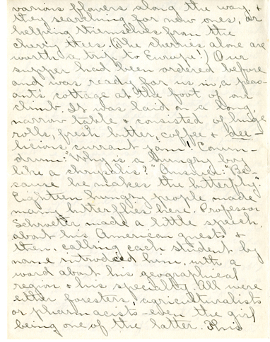 10 various flowers along the way & they searching for new ones, or helping themselves from the cherry trees. (The cherries alone are worth a trip to Europe!) Our supper had been ordered before and was ready for us in a peasant’s cottage at the foot of our climb. It was laid on a long narrow table & consisted of huge rolls, fresh butter, coffee & dee licious currant jam! Conundrum: “Why is a hungry boy like a chrysalis?” Answer: “Because he makes the butterfly.” Eighteen hungry people made many butterflies here. Professor Schrueter made a little speech about his American guest & then, calling each student by name introduced him with a word about his geographical region & his speciality. All were either foresters, agriculturalists or pharmacists — even the girl being one of the latter. This