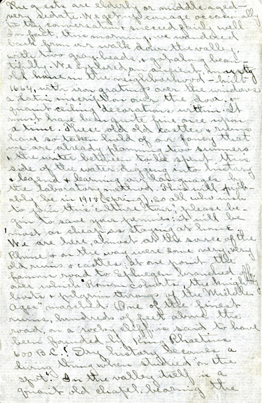 2 The guests are elderly or middle aged — very sedate. We get up courage occasionally to try conversation & succeed fairly well. In fact, this morning, we wandered back from our walk down the valley, with two gray-heads, & got along beautifully. We explored an ancient, musty old house in the neighborhood — built 1664, with iron gratings over the windows a Latin inscription over the door, & quaint ceiling decorations within. It must have been quite fine once upon a time. These old old castles & ruins have so taken hold of our fancy that we are already planning two summers & the winter between to be spent this side of the water digging into history & legend & learning our languages by the laboratory method. This will probably be in 1915 (spring), so all who wish to join this “culture tour,” please begin to save your pennies: it will be ‘most as cheap, as staying at home. We are here, almost at the source of the Rhine & on the way were some very, very old ruins & castles; at one point the famous road to Spluegen branched off over which “Roman cohorts, the knightly hosts & pilgrim throngs of the Middle Ages” marched. One of the finest ruins, hundred of feet above the road, on a rocky cliff, is said to have been founded by King Rhaeticus 600 B.C.! Dry history becomes a living thing when studied “on the spot.” In the valley itself is a quaint old chapel, bearing the