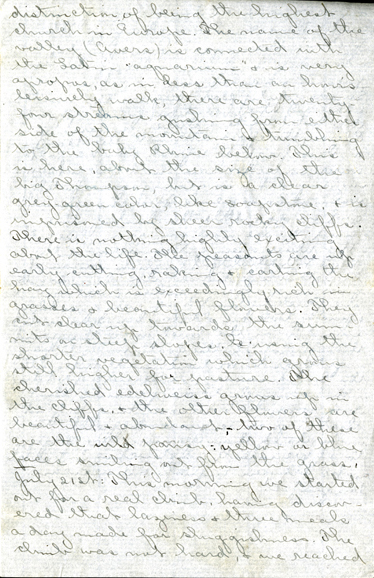 3 distinction of being the highest church in Europe. The name of the valley ( Avers ) is connected with Latin “aquarium” & is very apropos, as in less than an hour’s leisurely walk, there are twenty-four streams gushing from either side of the mountains & tumbling to the baby Rhine below. This is here, about the size of the big Thompson, but is a clear grey-green color, like soapstone & is imprisoned by sheer rocky cliffs. There is nothing highly exciting about the life. The peasants are up early, cutting, raking & carting the hay which is exceedingly rich in grasses & beautiful flowers. They cut clear up towards the summits on steep slopes te using the shorter vegetation which grows still higher for pasture. The cherished edelweiss grows up in the cliffs, & other flowers are beautiful & abundant — two of these are the wild pansy; yellow or blue faces smiling out from the grass. July 21st: This morning we started out for a real climb, having discovered that laziness & three meals a day made for sluggishness. The climb was not hard, & we reached