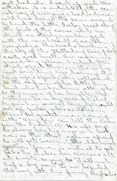 2 cart-load, when I went up-grade. Nevertheless, it is undoubtedly the easiest way of carrying a load, & I never could have carried the same amount by hand. The little doctor raced along the first of the course, while we struck our steady mountain gait, with the usual result of overtaking everybody on the road & reaching the top of the Statterberg Pass, first & with good breath. Our companions proved very pleasant indeed. Mrs. Misch spent three months in England some time ago, learning the language & speaks very well, much to the confusion of her little husband, who makes brave attempts to the music of her laughter. Nevertheless, he is an accomplished linguist in several languages, could reel off poetry, jokes & riddles in them. He greeted us one evening with “very few can tell the Pecan from the Tucan,” etc. His wife says he always has his nose in a book even on the street, & she is afraid he will get “overrun.” She, like most German frauen is inclined to get fat & he makes her exercise & cut out sweets, saying be “I will not haf a big von.” So we beguiled the way with his funny English &