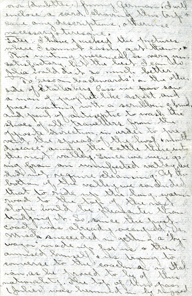 3 our (doubtless) funny German. I will enclose a card, showing this trip & save any descriptions otherwise necessary & tiresome. Later: I have packed the pictures where I cannot easily get them. & This writing piecemeal is very unsatisfactory, but the best I can do. Julia would do it so much better. To “ resoom backwards”: on the other side of Statterberg Pass we pas saw a man of prophet-like aspect and pose waiting with a scrubbing-brush, and pail of antiseptic to wash the shoes of all travellers from the opposite direction, in order to prevent the spread of the “hoof & mouth disease” among the cattle there into the next valley. Since we were going from an uninfected valley, we did not require cleaning. At the bottom of the valley, we concluded that to ride up the long, warm road to the top of the next slope would be pleasanter than trudging it. So, since the post coach was already occupied, Dr. Misch succeeded in getting a “by-wagon” made up for us & then amused himself & us trying to converse to the coachman in Italian, as he proved to be of this nationality. The top of this pass (Julier) was hemmed in by rugged