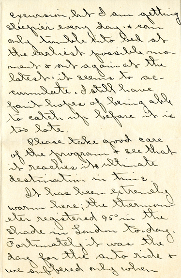 2 excursion, but I am getting sleepier every day, & can only tumble into bed at the earliest possible moment & out again at the latest: it seems to accumulate. I still have faint hopes of being able to catch up before it is too late. Please take good care of the program & see that it reaches its ultimate destination in time. It has been extremely warm here; the thermometer registered 95° in the shade in London today. Fortunately it was the day for the auto ride & we suffered only when walking. I enclose the map for the trip to-day. 10:30 p.m.; packing all done -but so sleepy.