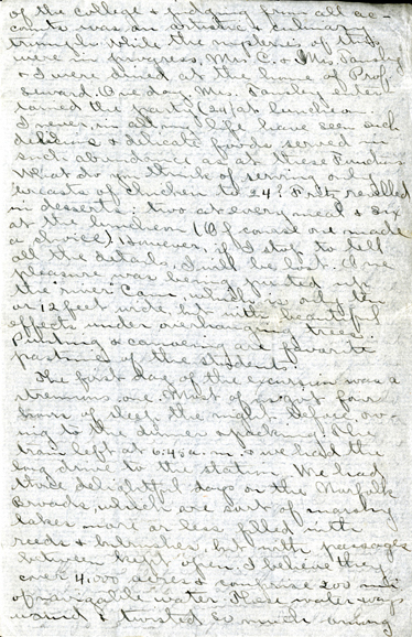 3 of the college & judging from all accounts was an artistic & culinary triumph while the mysteries of this were in progress. Mrs C. & Mrs. Tansby & I were dined at the home of Prof. Seward . One day, Mrs. Tansby entertained the party (24/at luncheon. I never, in all my life have seen such delicious & delicate foods served in such abundance as at these Functions. What do you think of serving only breasts of chicken to 24? Fritz revelled in desserts: two at every meal & six at the luncheon (Of course one made a choice). However, if I stop to tell all the details, I will be lost. One pleasure was being punted up the “river” Cans, (colne????) which is only ten or 12 feet wide, but with beautiful effects under overhanging trees. Punting & canoeing are favorite pastimes of the students. The first day of the excursion was a strenuous one. Most of us got four hours of sleep the night before, owing to the dinner & packing. The train left at 6:45 a.m. & we had the long drive to the station. We had three delightful days on the Norfolk Broads, which are sort of marshy lakes more or less filled with reeds & bulrushes, but with passages between kept open. I believe they cover 4,000 acres & comprise 200 miles of navigable water. These water ways wound & twisted so much among