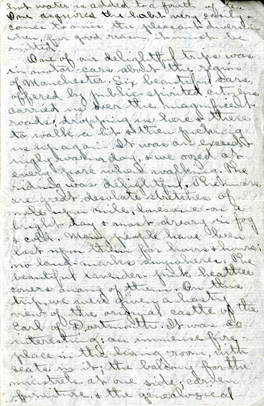7 hot water is added to a fourth of tea. One acquires the habit very easily & comes to miss the pleasant diversion when, for good reason, it must be omitted. One of our delightful trips was in motor-cars about the region of Manchester . Six beautiful cars, offered by public-spirited citizens carried us over the magnificent roads; dropping us here & there to walk a bit & then picking us up again. It was an exceedingly warm day, & we oozed at every pore when walking. The riding was delightful. The moors are great desolate stretches of mile upon mile, lonesome on a bright day & most dreary in fog & cold. Many people have been lost upon them for hours & hours; no land-marks anywheres. The beautiful lavender-pink heather covers many of them. On this trip, we were given a hasty view of the original castle of the Earl of Dartmouth. It was so interesting: an immense fireplace in the living-room, with seats in it; the balcony for the minstels at one side; carven furniture, & the genealogical