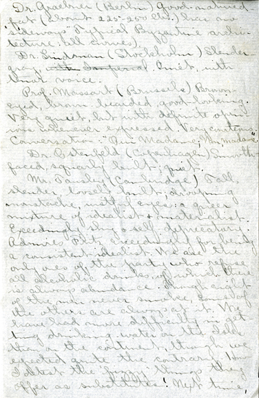 6 Dr. Graebner ( Berlin ) Good-natured – fat (about 225-250 lbs.) has no “sideways” Typical Byzantine architecture: all curves). Dr. Lindman ( Stockholm ) Slender – gray, with Imperial met, with tenor voice. Prof. Massart ( Brussels ) Brown-eyed, brown-bearded, good-looking. Very quiet, but with definite opinions whenever expressed. Very courteous. Conversation: “ Qui Madame; Non, Madame. ” Dr. Ostenfeld ( Copenhagen ) Smooth-faces, squarely build, quiet. Mr. Tansley ( Cambridge ) Tall, slender, loosely built, drooping moustache, wistful eyes; a queer mixture of idealist & materialist . Exceedingly shy & self-deprecatory. Admires Fritz exceedingly for being a consistent idealist. We are the only ones of the party who refust all alcoholic drinks, of which there is always abundance. Though eight of the men never smoke, some of the others are always at it. We have had more difficulty in getting drinking water on the Isles than on the continent, though we expected quite the contrary. How I detest the “fizzy” things they offer as substitutes! Next time,