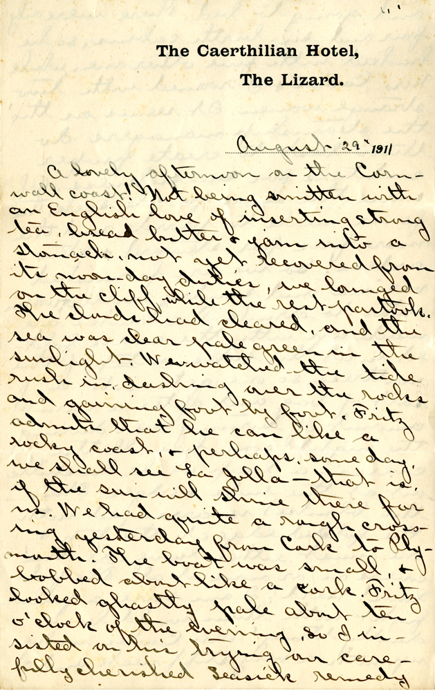 1 A lovely afternoon on the Cornwall coast! Not beeing smitten with an English love of inserting strong tea, bread butter & jam into a stomach, not yet recovered from its noon-day duties, we lounged on the cliff while the rest partook. The clouds had cleared, and the sea was clear pale green in the sunlight. We watched the tide rush in dashing over the rocks and gaining foot by foot. Fritz admits that he can like a rocky coast, & perhaps, someday, we shall see La Jolla — that is if the sun will shine there for us. We had quite a rough crossing yesterday from Cork to Plymouth . The boat was small, & bobbed about like a cork. Fritz looked ghastly pale about ten o’clock of the evening, so I insisted on his trying our carefully cherished seasick remedy