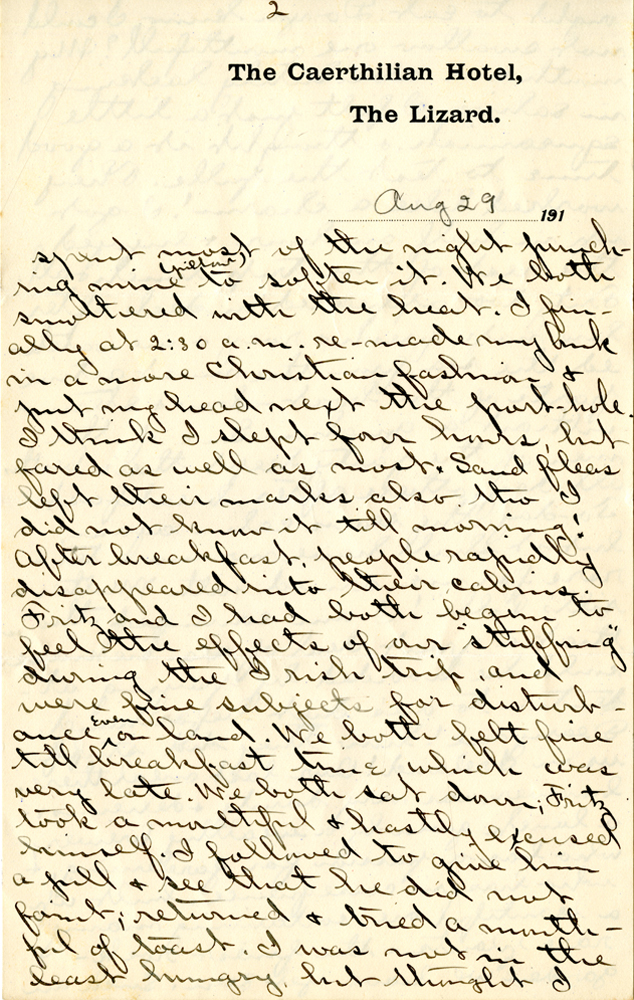 3 spent most of the night punching mine (pillow) to soften it. We both smothered with the heat. I finally at 2:30 a.m. re-made my bunk in a more Christian fashion & put my head next to the port-hole. I think I slept four hours, but fared as well as most. Sand fleas left their marks also tho I did not know it till morning! After breakfast, people rapidly disappeared into their cabins. Fritz and I had both begun to feel the effects of our “stuffing” during the Irish trip, and were fine subjects for disturbance even on land. We both felt fine till breakfast time which was very late. We both sat down; Fritz took a mouthful & hastily excused himself. I followed to give him a pill & see that he did not faint; returned & tried a mouthful of toast. I was not in the least hungry, but thought I