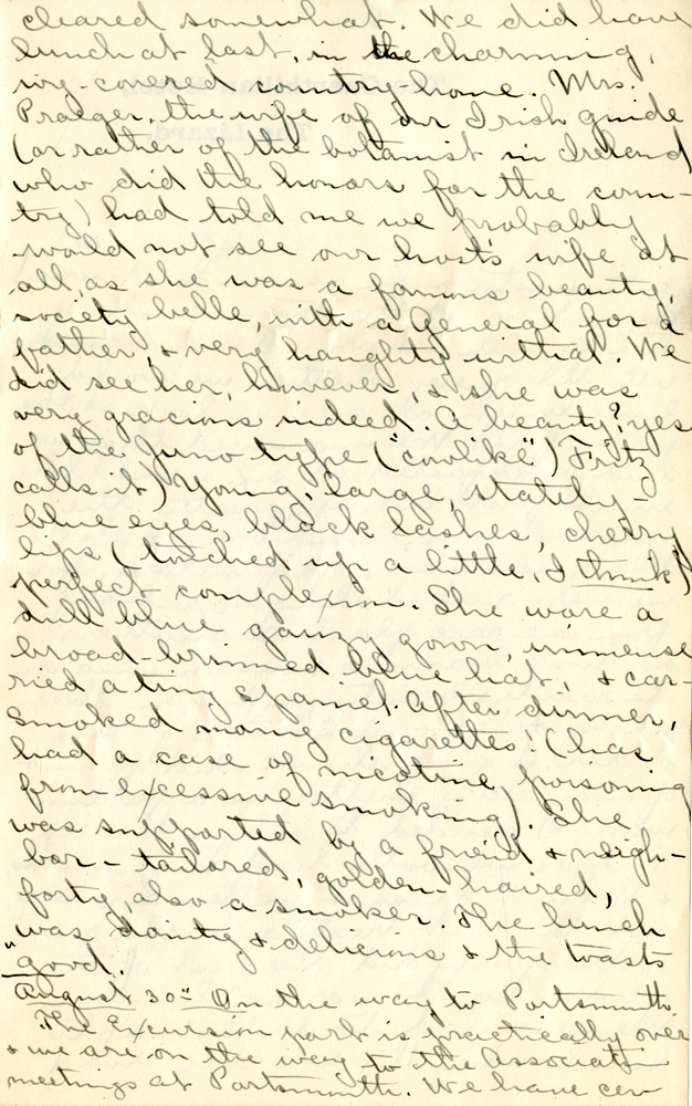 6 cleared somewhat. We did have lunch at last, in the charming, ivy-covered country-home. Mrs. Praeger , the wife of our Irish guide (or rather of the botanist in Ireland who did the honors for the country) had told me we probably would not see our host’s wife at all, as she was a famous beauty, society belle, with a General for a father & very haughty withal. We did see her, however, & she was very gracious indeed. A beauty? Yes of the Juno type (“cowlike”) Fritz calls it) Young, large, stately — blue eyes, black lashes, cherry lips (touched up a little, I think ) perfect complexion. She wore a dull blue gauzy gown, immense broad brimmed blue hat, & carried a tiny spaniel. After dinner, smoked many cigarettes! (has had a case of nicotine poisoning from excessive smoking). She was supported by a friend & neighbor-tailored, golden-haired, forty, also a smoker. The lunch was dainty & delicious & the toasts good . August 30″ On the way to Portsmouth The Excursion part is practically over & we are on the way to the Association meetings at Portsmouth . We have cer-