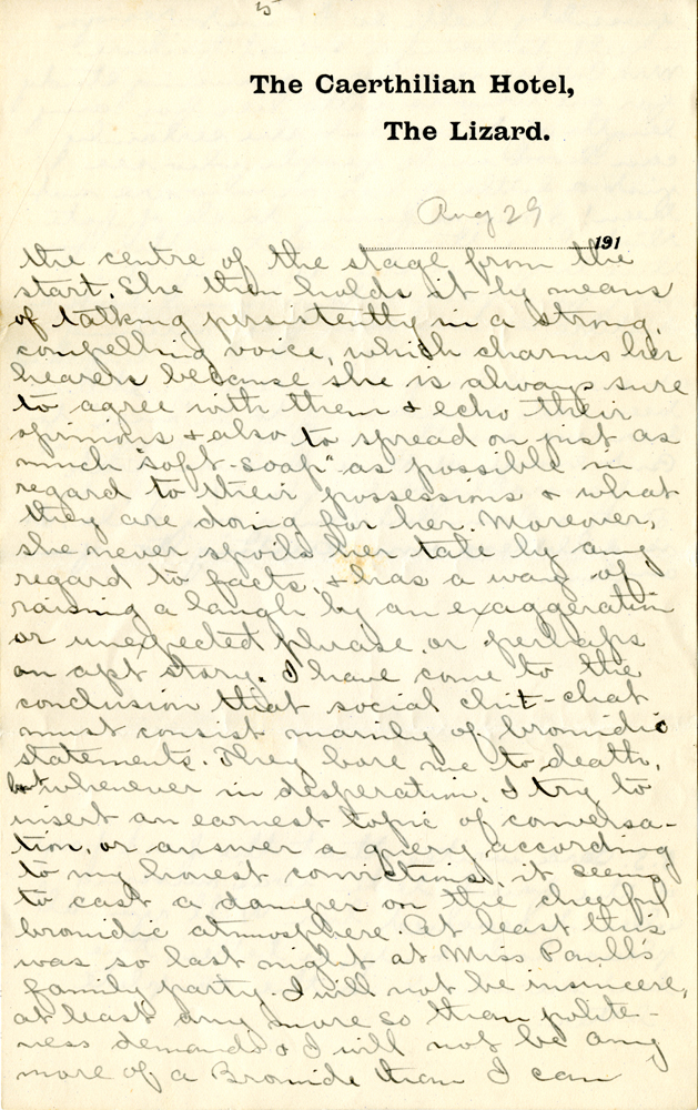 9 the centre of the stage from the start. She then holds it by means of talking persistently in a strong compelling voice, which charms her hearers because she is always sure to agree with them & echo their opinions & also to spread on just as much “soft-soap” as possible in regard to their possessions & what they are doing for her. Moreover, she never spoils her tale by any regard to facts, & has a way of raising a laugh by an exaggeration or unexpected phrase, or perhaps an apt story. I have come to the conclusion that social chit-chat must consist mainly of bromidic statements. They bore me to death, but whenever in desperation I try to insert an earnest topic of conversation, or answer a query, according to my honest convictions, it seems to cast a damper on the cheerful bromidic atmosphere. At least this was so last night at Miss Paulls’s family party. I will not be insincere, at least any more so than politeness demands & I will not be any more of a Bromide than I can