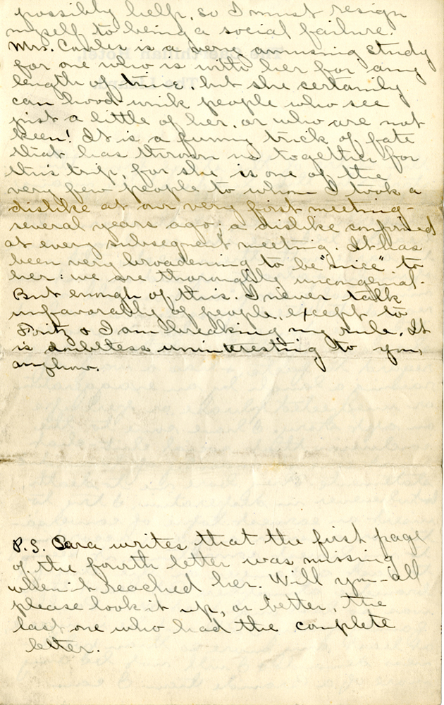 10 possibly help, so I must resign myself to being a social failure. Mrs. Cowles is a very amusing study for one who is with her for any length of time, but she certainly can hood wink people who see just a little of her, or who are not keen! It is a funny trick of fate that has thrown me together for this trip, for she is one of the very few people to whom I took a dislke at our very first meeting — several years ago; a dislike confirmed at every subequent meeting. It has been very broadening to be “nice” to her; we are thoroughly uncongenial. But enough of this. I never talk unfavorably of people, except to Fritz & I am breaking my rule. It is doubtless uninteresting to you, anyhow. P.S. Sara writes that the first page of the fourth letter was missing when it reached her. Will you all please look it up, or better, the last one who had the complete letter.
