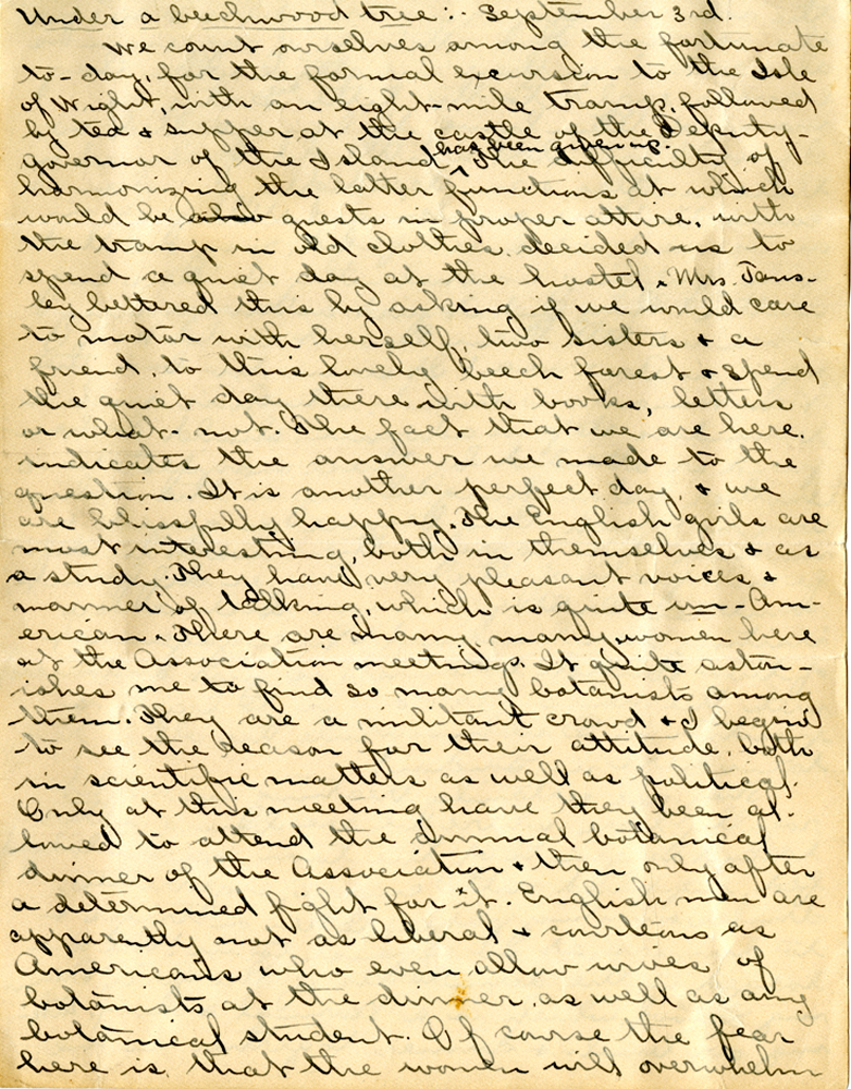 1 Under a beechwood tree: September 3rd. We count ourselves among the fortunate to-day , for the formal excursion to the Isle of Wright, with an eight mile tramp, followed by tea & supper at the castle of the Deputy-Governor of the Island has been given up. The difficulty of harmonizing the latter functions at which would be abou guests in proper attire, with the tramp in old clothes decided us to spend a quiet day at the hostel & Mrs. Tansley bettered this by asking if we would care to motor with herself, two sisters & a friend to this lonely beech forest & spend the quiet day there with books, letters or what-not. The fact that we are here indicates the answer we made to the question. It is another perfect day & we are blissfully happy. The English girls are most interesting, both in themselves & as a study. They have very pleasant voices & manner of talking, which is quite un -American & there are many, many women here at the Association meetings. It quite astonishes me to find so many botanists among them. They are a militant crowd & I begin to see reasons for their attitude, both in scientific matters as well as political. Only at this meeting have they been allowed to attend the annual botanical dinner of the Association & then only after a determined fight for it. English men are apparently not as liberal & courteous as Americans who even allow wives of botanists at the dinner, as well as any botanical student. Of course the fear here is that the women will overwhelm