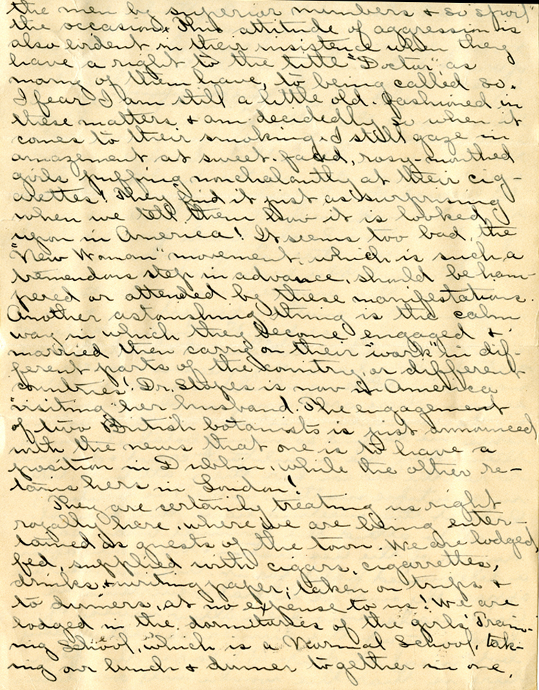 2 the men by superior numbers & so “spoil” the occasion. This attitude of aggression is also evident in their insistence when they have a right to the little “Doctor” as many of them have, to being called so. I fear I am still a little old-fashioned in these matters & am decidedly so when it comes to their smoking. I still gaze in amazement at sweet-faced, rosy-mouthed firls puffing nochalantly at their cigarettes! They find it just as surprising when we tell them how it is looked upon in America! It seems too bad, the “New Woman” movement, which is such a tremendous step in advance, should be hampered or attended by these manifestations. Another astonishing things is the calm way in which they become engaged & married then carry on their “work” in different parts of the country, or different countries! Dr. Stopes is now in America “visiting” her husband. The engagement of two British botanists is just announced with the news that one is to have a position in Dublin, while the other retains hers in London! They are ceratinly treating us right royally here, where we are being entertained as guests of the town. We are lodged, fed, supplied with cigars, cigarettes, drinks, & writing paper; taken on trips & to dinners, at no expense to us! We are lodged in the dormitories of the girls’ Training School, which is a Normal School, taking our lunch & dinner together in one,