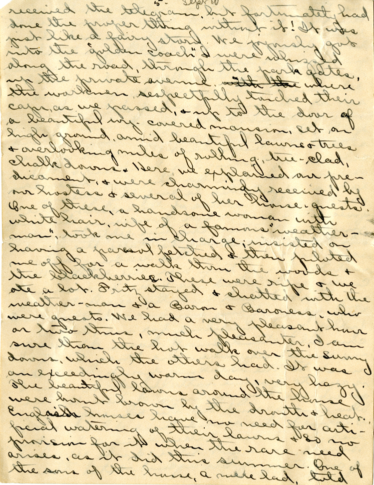 9 received the telegram, but fortunately had done the proper thing without it! It was just like a fairy story. We joyously got into the “golden coach” & were whizzed along the road, through the park gates, up the private avenue, with the where the workmen respectfully touched their caps, as we passed, & up to the door of a beautiful ivy-covered mansion, set on high ground amid beautiful lawns & trees & overlooking miles of rolling, tree-clad chalk downs. Here, we explained our predicament, & were charmingly received by our hostess & several of her house guests. One of these, a handsome woman with white hair, wife of a famous “weather-man,” took me in charge; insisted on having a paresol fetched & then piloted me off for a walk thru the woods & the blackberries. These were ripe & we ate a lot. Fritz stayed & chatted with the weather-man & a Baron & Baroness, who were guests. We had a very pleasant hour or two thus, much pleasanter, I am sure than the hot walk over the sunny downs, which the others had. It was an exceedingly warm day, very hazy. The beautiful lawns around the house were burnt brown by the drouth & heat. English houses have no need for artificial watering of their lawns & so no provision for it when the rare need arises, as it did this summer. One of the sons of the house, a mere lad, told