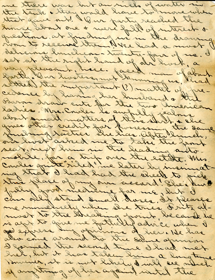 10 me there was but an inch of water in the tank & they would have to move when that gave out! Our party reach the house about one & were full of interest & questions, at finding us in the drawing room to receive them! We had a most delicious luncheon — twenty-four of us. I sat at the right hand of our host, a very pleasant, nice-faced man of about forty. Our hostess, not knowing us, has settled the important (?) matter of precedence by having her husband & the Baron draw cuts for the two American ladies. Mrs. Cowles is awfully jealous about small matters of this sort & she gives other credit for possessing the same pushing tactic she has. After lunch, our host asked me to take the front seat, next to him in the leading automobile, for a trip over the estate. Mrs. Cowles quite “riled” me later by insinuating that I had had the cheek to pick this place of my own accord! She’s awfully good medicine for me, but I can only stand small doses. It pleases me immensely when she tries Fritz almost to the breaking point, because he is apt to give me fatherly advice when I ge express my opinions of her. He has also come around to the same opinion I formed the second time I had met her, but is has taken him a long time. However, it is not likely I will see much if anything of her again until the