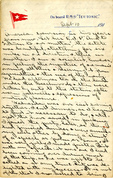 Sept. 10, 1911 American excursion in two years from now. Let her “R.I.P.” and to “return to our mutton,” the estate was beautiful, stretching for six miles in one direction & three in another. I am a socialist, however, in feeling the injustice of one man’s owning all this & reserving it from agriculture & the use of the many. We had afternoon tea on the lawn under the beechwoods & then were taken by auto to the station, after warm farewells & expressions of mutual pleasure. Wednesday was our last evening together. I cut dinner, as I begin to find it necessary to do & utilized the hour saved, in packing. I joined the party, later, as they had finished dinner & were amusing each other by doing a “stunt” of a speech or poem or song. It was very jolly. I made quite a hit with my speech: it was one I had been conning over during most of the trip, as one was apt to be called on at any time. Fritz was delighted with my success. It is not often that I am asked to bring