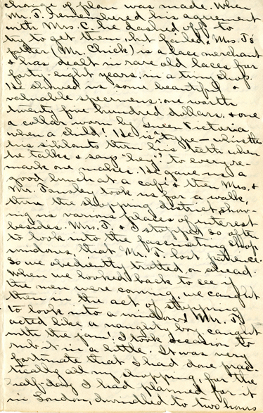 3 change of plan was made. When Mr. T. remembered his agreement with Mrs. C. he dashed off to try to get them, but failed. Mrs. T’s father ( Mr. Chick ) is a lace merchant & has dealt in rare old laces for forty-eight years, in a tiny shop. He showed us some beautiful & valuable specimens: one worth twenty-five hundred dollards, & one a collar worn by Queen Victoria when a child! He is a type — whistles his sibilants thru his teeth when he talks & says “hey”? to every remark one makes. He gave us a good lunch at a café & then Mrs. & Mr. Tansley took us for a walk thru the shopping district, showing us various places of interest besides. Mrs. T. & I stopped so often to look into the fascinating shop windows, that Mr. T. lost patience. So we obediently trotted on ahead. When we looked back to see if the men were coming, we caught them in the act of stopping to look into a window! Mr. T. acted like a naughty boy caught with the jam! I took occasion to rub it in a little. It was very fortunate that I had done practically all my shopping, for the half-day I had planned for it in London , dwindled to two hours