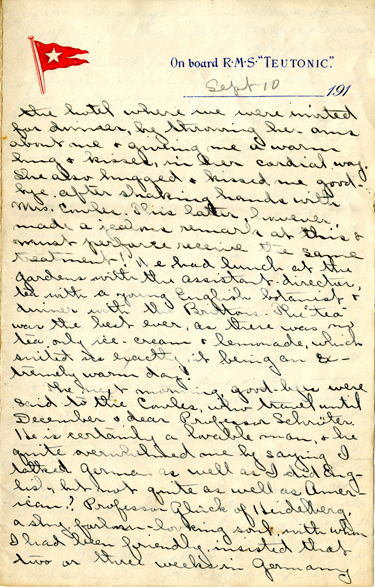 5 the hotel where we were invited for dinner, by throwing her arms about me & giving me a warm hug & kisses, in her cordial way. She also hugged & kissed me good-bye, after shaking hands with Mrs. Cowles . This later, however, made a jealous remark at this & must perforce receive the same treatment! We had lunch at the Gardens with the assistant director, tea with a young English botanist & dinner with the Brittons . The “tea” was the best ever, as there was no tea only ice-cream & lemonade, which suited us exactly, it being an extremely warm day! The next morning, good-byes were said to the Cowles , who travel until December & dear Professor Schrüter . He is certainly a lovable man, & he quite overwhelmed me by saying I talked German as well as I did English, but not quite as well as American? Professor Glück of Heidelberg , a shy, forlorn-looking sort with whom I had been friendly insisted that two or three weeks in Germany