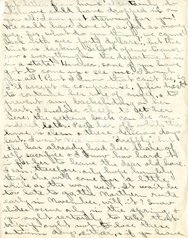 2 fat letter from home! I certainly do wish we could have dropped in on you all: I am just starving for you! We could have done it, as far as money goes, for what do you think, we came back with over forty dollars!, but the time is lacking. School opens tomorow & everything in the department is in a state! However, some of you have got to come up & see me. I want you all! But I know that can’t be, so I’ll accept a compromise. Julia has got to continue her role of angel, & to prevent any backsliding on her part, I enclose check to get her here: the getting back can be considered later. Pack her off while the house is clean & these delicious days last. I want Marmee “dreffly”, but she has already had her share of self-sacrifice & I know how hard it is for her to leave the dear old home. I can, therefore, only hope humbly that she will come for a little while on the way west. It won’t be too late to go, the Northern route early in November, will it? Snow slides occur only in the spring, & you ought certainly to take that trip. You ought not to lose these autumn days either, & if you have