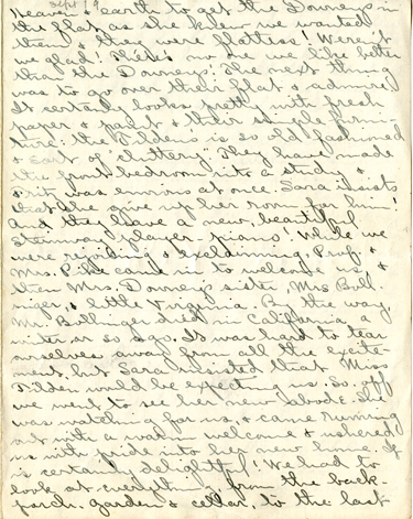 5 Heaven & earth to get the Downeys in the flat as she knew we wanted them & they were flatless! Weren’t we glad! There’s no one we like better than the Downeys ! The next thing was to go over their flat & admire. It certainly looks pretty with fresh paper & paint & their simple furniture: the Tilden’s is so old fashioned & sort of “cluttery.” They have made the front bedroom into a study & Fritz was envious at once. Sara insists that she give up her room for him! And they have a new, beautiful Steinway player-piano! While we were rejoicing & exclaiming, Prof & Mrs. Pike came in to welcome us & then Mrs. Downey ‘s sister, Mrs Bollinger , & little Virginia . By the way, Mr. Bollinger died in California a winter or so ago. It was hard to tear ourselves away from all the excitements, but Sara insisted that Miss Tilden would be expecting us. So off we went to see her new abode. She was watching for us, & came running out with a warm welcome & ushered us with pride into her new home. It is certainly delightful! We had to look at everything from the back porch, garden & cellar, to the last