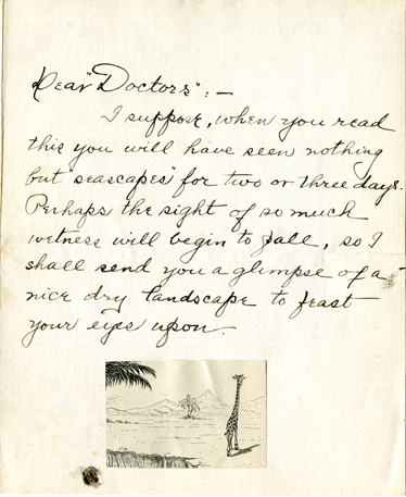 1 Sept. 19, 1911 Dear "Doctors"- I support, when you read this you will have seen nothing but “seascapes” for two or three days. Perhaps the sight of so much wetness will begin to pall , so I shall send you a glimpse of a nice dry landscape to feast your eyes upon.