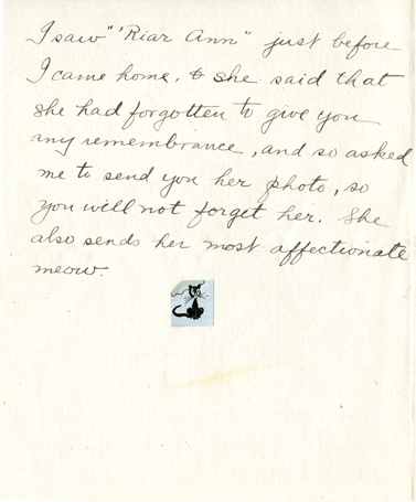 6 I saw “Riar Ann” just before I came home, & she said that she had forgotten to give you any remembrance, and so asked me to send you her photo, so you will not forget her. She also sends her most affectionate meow.