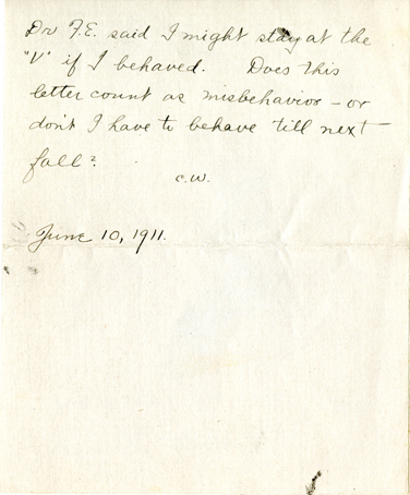 7 Finnally I send you this professorial picture, so you will not forget Minnesota Dr. F.E. said I might stay at the “V” if I behaved. Does this letter count as misbehavior — or don’t I have to behave to till next fall? C. W.