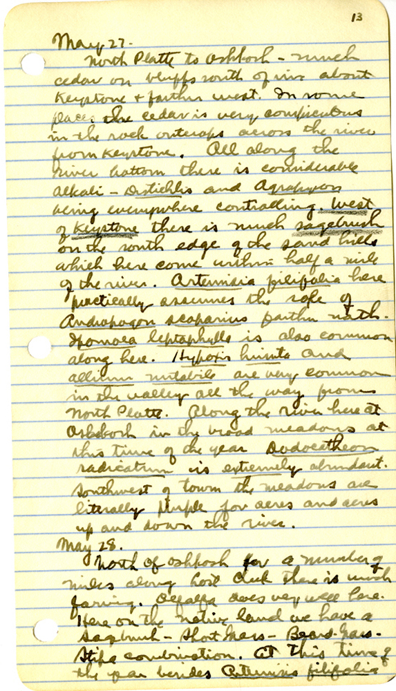 17 13 May 27- North Platte to Oshkosh - much cedar on bluffs south of river about Keystone & farther west. In some places, the cedar is very conspicuous in the rock outcrops across the river from Keystone. All along the river bottom there is considerable Alkali - Distichlis and Agropyron being everywhere controlling. West of Keystone there is much sagebrush on the south edge of the sand hills which here come with half a mile of the river. Artemisia filifolia here practically assumes the role of Andropogon scoparius farther north. Ipomoea leptaphylla is also common along here. Hypoxis hirsuta and Allium mutabile are very common in the valley all the way from North Platte . Along the river here at Oshkosh in the broad meadows at this time of the year Dodecatheon radicatum is extremely abundant. Southwest of town the meadows are literally simple for acres and acres up and down the river. May 28 North of Oshkosh for a number of miles along Lost Creek there is much farming. Alfalfa does very well here. Here on the native land we have a sagebush - short grass - beard grass - Stipa combination. At this time of the year besides Artemisia filifolia