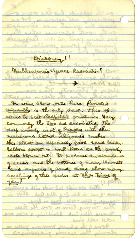 26 Discovery!! Muhlenbergia - Yucca Association! In some blow-outs here Psoralea micrantha is the only plant. This sp. ​ spatulata seems to beat Redfieldis sometimes. Very commonly the two are associated. The deep woody root of of Psoralea with their numerous lateral rhizomes makes this plant an especially good sand binder. Seldom except in worst places are the woody roots blown out. It produces an abundance of seeds and the bottoms of many blowouts and surfaces of sand area show many seedlings of this species at this time of year !