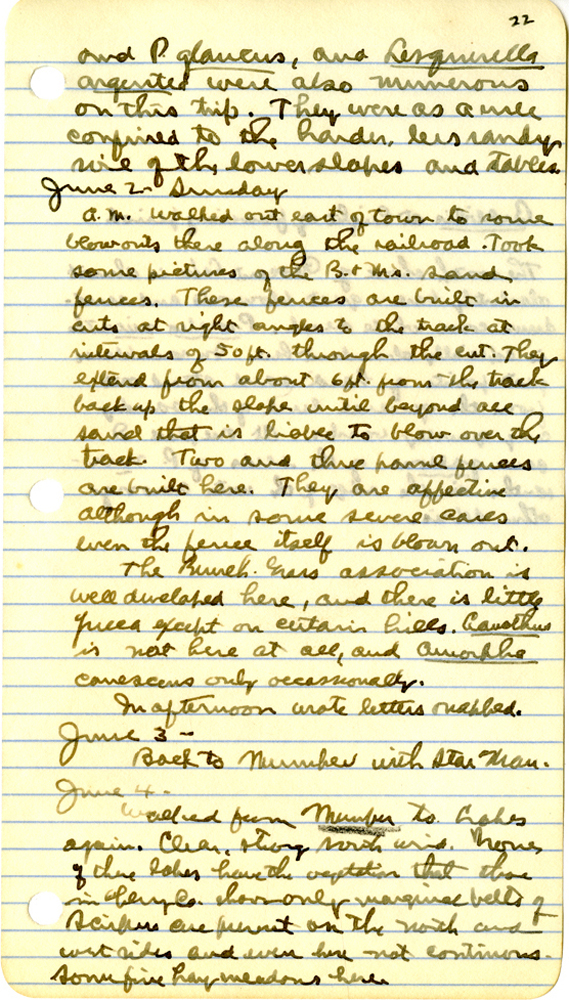 31 22 and P. glaucus , and Lesquerella argentea were also numerous on this trip. They were as a rule confined to the harder, less sandy soil of the lower slopes and tables. June 2 - Sunday A.M. walked out east of town to some blowouts there along the railroad. Took some pictures of the B. & M.'s sand fences. These fences are built in cuts at right angles to the track at intervals of 50 ft. through the cut. they extend from about 6 ft. from the track back up the slope until beyond all sand that is liable to blower over the track. Two and three normal fences are built here. They are affective although in some severe cases even the fence itself is blown out. The Bunch Grass asscociation is well developed here, and there is little Yucca except on certain hills. Causthus is not here at all, and Amorpha canescens only occasionally. In afternoon wrote letters napped June 3- Back to Mumper with Stan Man. June 4- Walked from Mumper to Lakes again. Clear, strong south wind. None of the lakes have the vegetation that those in Cherry Co. ​ show only marginal belts of Scirpus are present on the north and west sides and even here not continuous. Some fine hay meadows here.