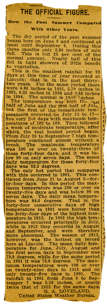 33 The Official Figure How the Past Summer Compared With Other Years. The dry period of the past summer began here on June 8 and conitnued at least until September 8. During this three months only 2.84 inches of rain fell. This is but 25 per cent of the normal amount. Nearly half of this fell in light showers of little benefit to vegetation. This is the smallest rainfall for 92 days at this time of year recorded at Lincoln; that is, in the past thirty two years. Form the same period there were 4.86 inches in 1881, 5.39 in 1901, 6.33 inches in 1886 and 9.86 inches in 1894. the normal is 11.33 inches. The temperature was high this last half of June and the first half of July , but the remarkable temperatures occured on July 13 to 17 - five very hot days with maximum temperatures of 102 to 109. then followed a week of moderate tempereature, after which the real heated period began. From July 26 to September 7 high temperature continued alomst without a break. The maximum temperature was 100 or over on twenty three of those forty-four days was ,and it was below 90 on only seven days. The mean daily temperature for these forty-four days was 83.5 degrees. The only hot period that compares with this occurred in 1901. This continued from June 21 to August 3 - for forty-four days. In this period the maximum temperature was 100 or over on twenty-five days and was below 90 on seven days. The daily mean temperature was 84.6 degrees. That is, the forty-four consecutive days of high temperature in 1901 were hotter than the forty-four days of the highest temperature in 1913. In 1901 the high temperatures occured in August and September, and were therefore more abnormal. The season of 1913, however, was the hottest on record here at Lincoln . The mean daily tempereature for June, July, Aguest adn the first seven days in September was 79.9 degrees, while for the same period in 1901 it was 78.6 degrees. The maximum temperatures were 100 or over on twenty-nine days in 1913 and on only twenty-five days in 1901. the rainfall in 1901 form June 8 to September 7 was 5.59 inches, or nearly twice that of 1913 for the same days. G.A. Loveland , United States Weather Bureau.