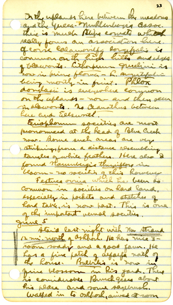 34 23 On the uplands here between the meadows and the Yucca & Muhlenbergia assoc. ​ there is much Stipa comata which really forms an association here. Of course, Calamovilfa longifolia is common on the high hills and edges of blowouts. Lithosperm gmelini ins now in prime flower - L. angustifolium being mostly in first. Phlox douglasii is everywhere common on the uplands - now and then occur in blowouts. No Ceanothus between hear and Ellsworth . Eriophorum societies are most pronounced at the head of Blue Creek now. Some such areas are very striking, from a distance resembling tangles of white feathers. Here also I found Naumburgia thyrsiflora in bloom - no society of this however. Festuca ovina which has been so common in societies of hard land, is now past. This is one of the imporant vernal societies. June 5 Staid ​ last night with Mr. Strand 12 mi. north of Oshkosh . He has nice 3 - room soddy and a good farm. He has a fine patch of Alfalfa north of the house. Bulbilis is now in fine blossom in his yard. There is considerable Bunch Grass about his place and some sagebrush. Walked in to Oshkosh , arrived at noon.
