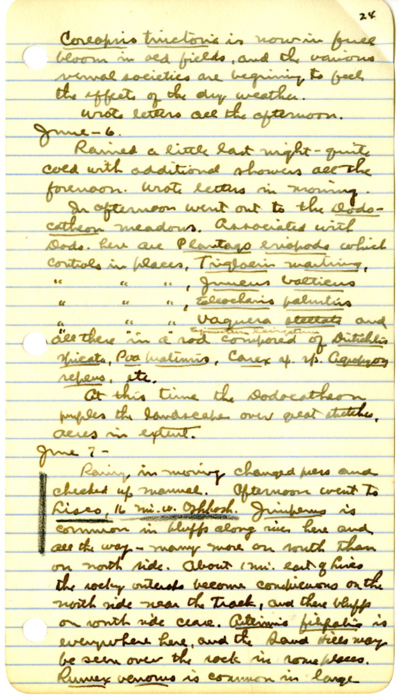 35 24 Coreopsis tinctoria is now in full bloom in old fields, and the various vernal societies are beginning to feel the effects of the dry weather. June -6 Rained a little last night - quite cold with additional showers all the forenoon. Wrote letters in morning. In afternoon went out to the Dodocatheon meadows. Associates with Dods. here Plantago eriopoda which controls in places, Triglochin maritima, " " ", Juncus balticus, " " ", Eleocharis palustris, " " ", Vaquera stellata and " " " Equisetum laevigatum , all there in a rod composed of Distichlis spicata , Poa malimsis , Carex sp. sp. Agropyron repens , etc. At this time the Dodecatheon pimples the landscape over great sketches, acres in extent. June 7- Rowing in morning changed piers and checked up manual. Afternoon went to Lisco , 16 mi. Oshkosh . Junipers is common in bluffs along river here and all the way - many more on the south than on north side. About 1 mi. east of Lisco the rocky outcrops become conspicuous on the North side near the track, and there bluffs on south side cease. Artemisia filifolia is everywhere here, and the Sand Hills may be seen over the rock in some places. Rumex venosus is common in large
