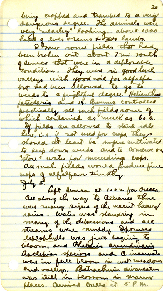 47 33 being cropped and tramped to very dangerous degree. The animals were very "measley" looking - about 1000 head of ewes & rams & 300 lambs. I saw some fields that had been broken out about 7 mi. south of Seneca that were in a deplorable condition. They were in good level valleys with good soil for alfalfa but had been allowed to go to weeds to a frightful degree. Helianthus petiolaris and H. Annuus controlled practically all such fields some of which contained as much as 60 a. If fields are allowed to stand idle here, i.e. if not used for crops, They should at least be surface cultivated to keep down weeds and to conserve or "store" water for succeding crops. All such fields would produce fine crops of alfalfa or timothy. July 5 Left Seneca at 10 am for Orella . All along the way to Alliance there waere many signs of the recent heavy rains. Water was standing in many of the dimensions and all streams were muddy. Ipomoea leptophylla was just begining to bloom, and Phalaris arundinacea , Asclepias speciosa and A. incarnata were in full bloom in wet meadows and valleys. Batrachium divaneaten was still in blossom in many places. Arrived Ocella at 5 p.m.