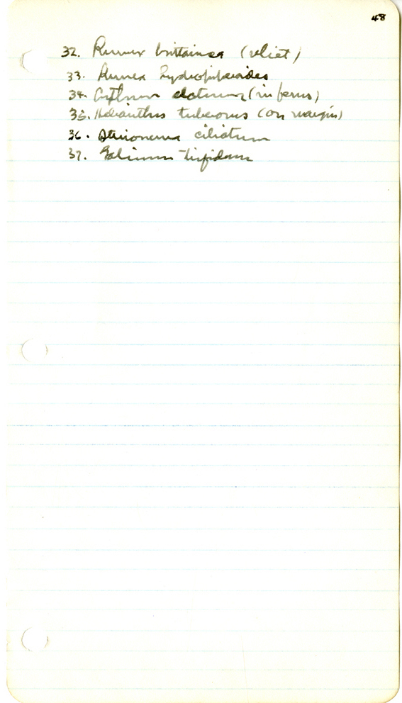 66 48 32. Rumex britannica (relict) 33. Rumex hydropiperoides 34. ? datum (in ferns) 35. Helianthus tuberosus (on margins) 36. Steironema ciliatum 37. Galium trifidum