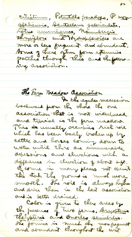 73 52 ciliatum , Potentilla paradoxa , P. monspeliensis , Scutellaria glabriuscula , Lotus americanus , Naumburgia thyrsiflora , and Rumex Hydropiperoides , are more or less frequent and abundant. Some of these often form extensive patches through this and the following association. The Fern Meadow Association In the regular succession backward from the shore the one association that is most widespread and typical is the fern meadow. This is usually occupies rich soil which has been badly broken up by cattle and horses coming down to water until there arem innumerable depressions in elevation with a differences in elevation of about 2 ft. ofcourse in many places not open to the stak the ground is much more smooth. The soil is always higher and dries than in the last association and is better drained. Color is given to there areas by the presence of two ferns, Dryopteris Thelypteris and Onoclea sensibilis . The former is much the more frequent and abundant throughout the wet