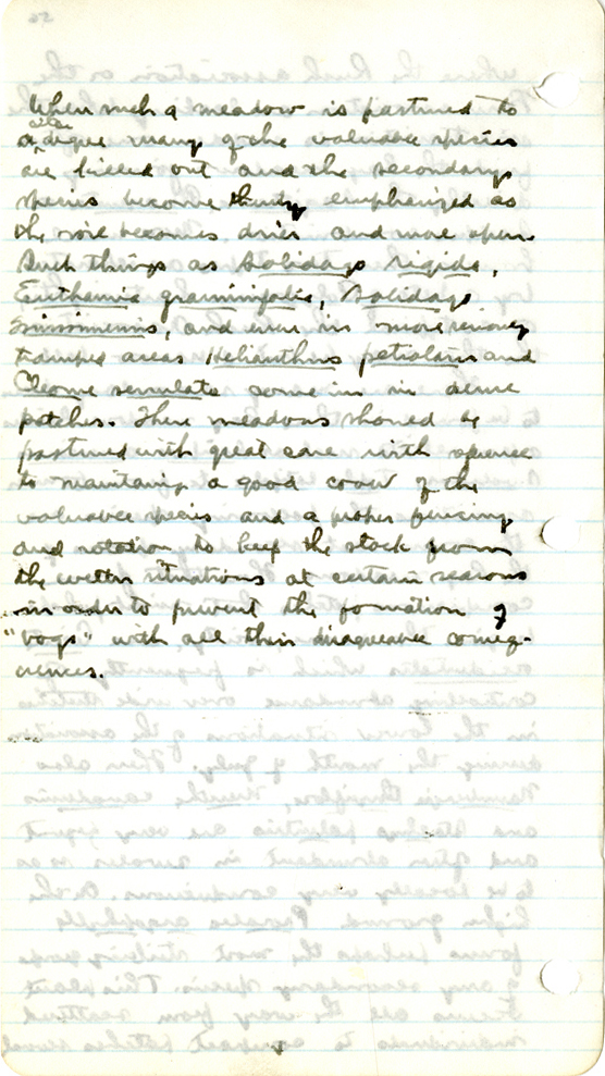 80 56 When such a meadow is pastured to a certain degree many of the valuable species are killed out and the secondary species become thirsty emphasized as the soil becomes drier and more open. Such things as Solidago rigida , Euthamia graminifolia , Solidago missouriensis , and were in more seriously trampled areas, Helianthus petiolaris , and Cleome serrulata come in in dense patches. These meadows should be pastured with great care with reference to maintaining a good cover of the valuable species and a proper fencing and notation to keep the stock from the wetter situations at certain seasons in order to prevent the formation of "bogs" with all disagreeable consequences.