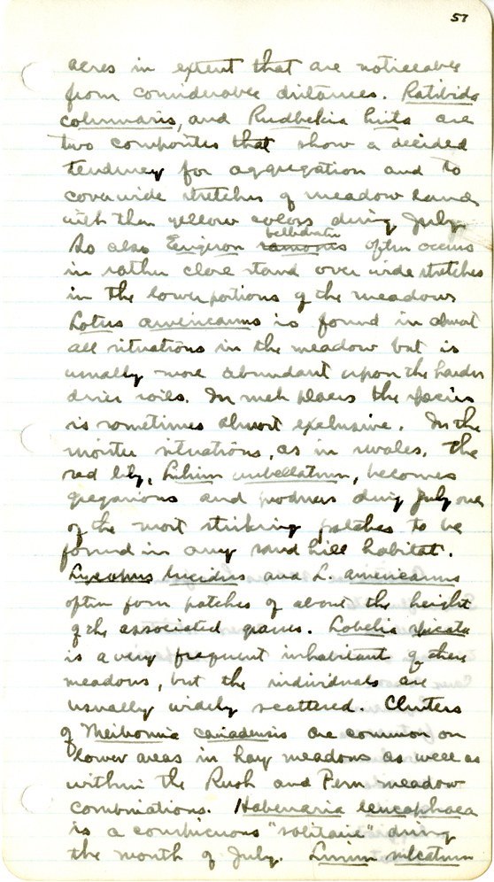 81 57 acres in extent that are noticeable from considerable distances. Ratibida columnaris , and Rudbeckia hirta are two composites that show a decided tendency for aggregation and to cover wide stretches of meadow land with their yellow colors during July. So called Erigeron ramosus bellidiastrum often occurs in rather close stand over wide stretches in the lower portions of the meadows Lotus americanus is found in almost all situations in the meadow but is usually more abundant upon the harder drier soils. In such places the species in sometimes alomst exclusive. In the moister situations, as in swales. The red lily, Lilium umbellatum , becomes gregarious and producer during July one of the most striking patches to be found in any sand hill habitat. Lycopus lucidus and L. americanus often form patches of about the height of the associated grasses. Lobelia spicata is a very frequent inhabitant of other meadows, but the individuals are usually widely scattered. Clusters of Meibomia canadensis are common on lower areas in hay meadows as well as within the Rush and Fern meadow combinations. Habenaria leucophaea is a conspicuous "solitaire" during the month of July. Linum sulcatum