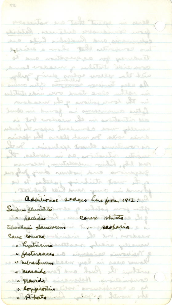 82 57 Additional sedges here from 1912: Scirpus fluviatilis " pallidus Carex stricta Eleocharis glaucescens " scoparia Carex comosa " hystericina " nebrascensis " marcida " gravida " longisortius " stipata