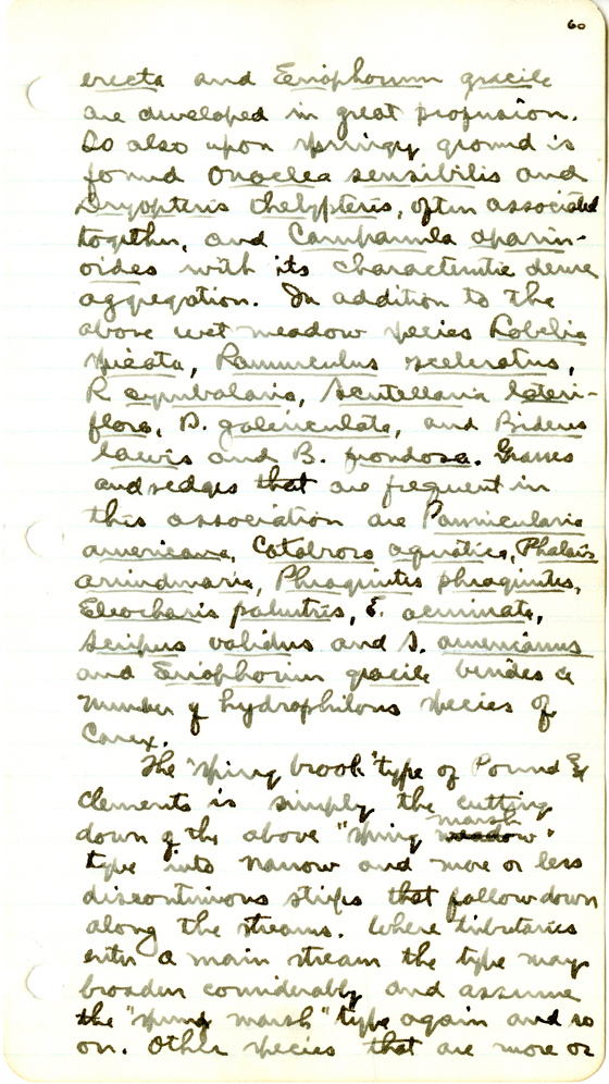 86 60 erecta and Eriophrum gracile are developed in great profusion. So also upon springy ground is found Onoclea sensibilis and Dryopteris thelypteris , often associated together, and Campanula aparinoides with its characteristic dense aggregation. In addition to the above wet meadow species Lobelia spicata , Ranunculus sceleratus , R. cymbalaria , Scutellaria lateriflora, D. galericulata , and and B. frondosa . Grasses and sedges that are frequent in this association are Panicularia americana , Catabrosa aquatica , Phalaris arundinacea , Phragmites phragmites , Eleocharis palustris , E. acuminata , Scirpus validus and S. americanus , Eriophorum gracile , besides a number of hydrophilous species of Carex . The "Spring Brook" type of Pound and Clements is simply the cutting down of the above "Spring meadow Marsh " type into narrow and more or less discontiunous strips that follow down along the streams. Where tributaries enter a main stream the type may broaden considerably and assume the "spring marsh" type again and so on. Other species that are more or