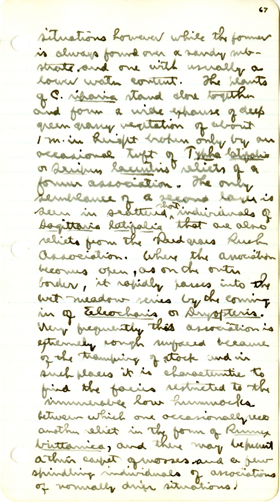 96 68 situations however while the former is always found over a sandy substrata and one with usually a lower water content. The plants of C. riparia stand alone together and form a wide expanse of deep green grassy vegetation of about 1 m. in height broken only by an occasional tuft of Typha latifola or Scirpus lacustris relicts of a former association. The only semblance of a second layer is seen in scattered short individuals of the Sagitaria latifolia that are also relicts from the Reed grass Rush Association. Where the association becomes open, as on the outer border, it rapidly pauses into the wet meadow series by the coming in of Eleocharis or Dryopteris . Very frequently this association is extremely rough surfaced became of the tramping of stock and in such places it is characteristic to find the facies restricted to the inumerable low hammocks between which one occasionally seeds another relict in the form of Rumex brittanica , and there may be plant a thin carpet of mosses, and a few spindling individuals of associations of normally drier situations.