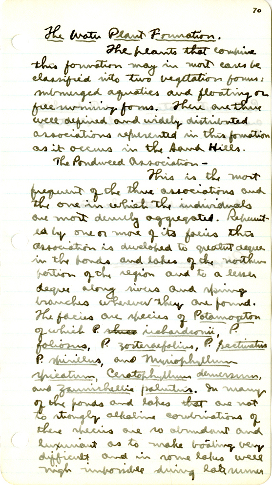 100 70 The Water Plant Formation The plants that comprise this formation may in most cases be classified into two vegetation forms: submerged aquatics and floating or free swimming forms. There are three well defined and widely distributed associations represented in this formation as it occurs in the Sand Hills. The Pondweed Association- This is the most frequent of the three associations and the one in which the individuals are most densely aggregated. Represented by one or more of its facies this association is developed to greater degree in the ponds and lakes of the northern portion of the region and to a lesser degree along rivers and spring branches wherever they are found. The facies are species of Potamogeton of which P. richardsonii , P. foliosus , P. zosterifolius , P. pectinatus , P. spirillus , and Myriophyllum spicatum , Ceratophyllum demersum , and Zannichellia palustris . In many of the ponds and lakes that are not to strongly alkaline combinations of these species are so abundant and luxuriant as to make boating very difficult, and in some lake well nigh impossible during late summer