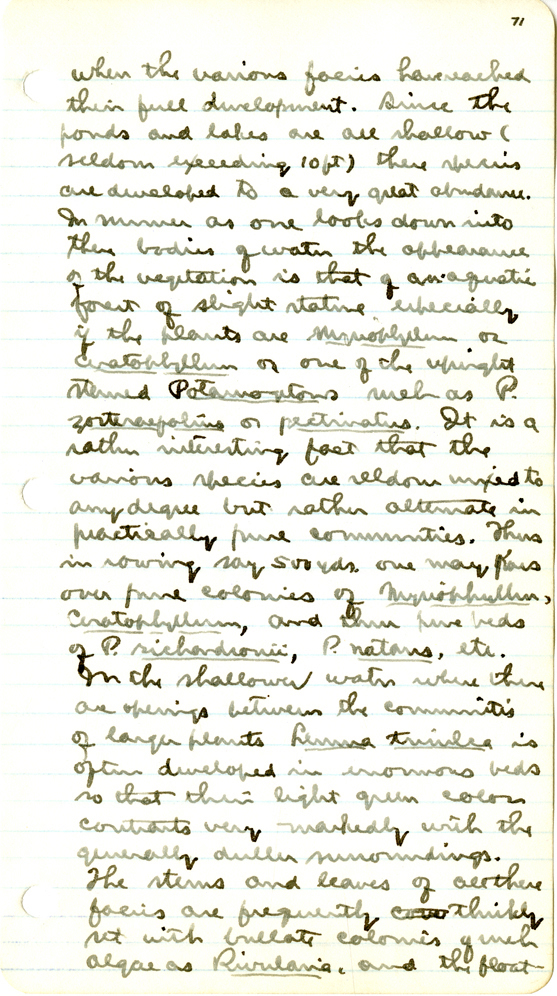 102 71 when the various facies have reached their full development. Since the ponds and lakes are all shallow(seldom exceeding 10ft) there species are developed to a very great abundance. In summer as one looks down into there bodies of water the appearance of the vegetation is that of an aquatic forest of slight stature especially if the plants are Myriophyllum or Ceratophyllum or one of the upright stemmed Potamogetons such P. zosterifolius or pectinatus . It is a rather interesting fact that the various species are seldom mixed to any degree but rather alternate in practically pure communities. Thus in rowing say 500 yds. one may pass over pure colonies of Myriophyllum , Ceratophyllum , and three pure beds of P. Richardsonii , P. Natans , etc. In the shallower water where there are openings between the communities of larger plants Lemna trisulca is often developed in enormous beds so that this light green color contrasts very markedly with the generally duller surrroundings. The stems and leavese of all there facies are frequently thickly set with bullate colonies of such algae as Rivularia , and the float -